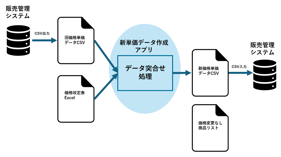販売管理システムから出力した商品マスタCSVと価格改定されたExcelを商品コードで紐づけし、新単価が取得できた商品コードの単価を新単価に書き換えたCSVを作成するアプリです。
